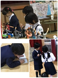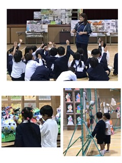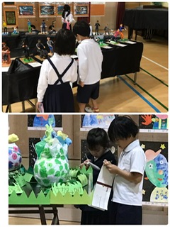 作品展では、各学年・学級で鑑賞の時間を持っています。1年生は初めて小学校の作品展を鑑賞しました。並べられた全学年の作品をみて、心ブルブル、感動していました。「これすごーくきれい!」「本物みたい!」「生きてるみたい!とび出してきそう」など、自然と感想が言葉になっていました。自分の兄弟姉妹の作品をみて、うれしそうな自慢げな表情も見られました。よいところを見つけてメモしている姿には、成長した様子を感じました。
