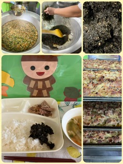 「のりつくだ煮」は、かつおぶし、しいたけ、きざみのりを使い砂糖、料理酒、みりん、濃口しゅうゆで煮ています。ご飯にとても合う一品です。「豚肉のスタミナ焼き」は、にんにくの風味と玉ねぎの甘みもありご飯がすすむ献立になっています。