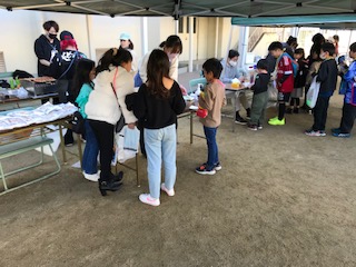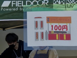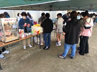 ポップコーンやフランクフルトに列が長く、みんな美味しそうな香りに誘われています!本当に美味しいですよ!先生もお手伝いです。