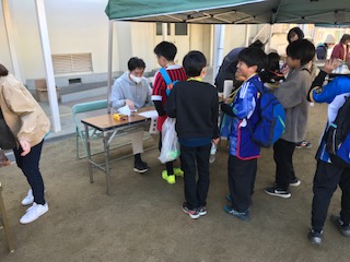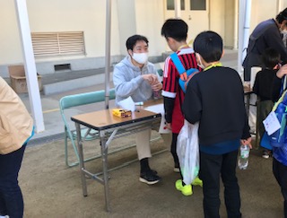 先生はくじ引き係担当。出た数の枚数で、みるくせんべいの重ね枚数が決まります。7枚が最高枚数です。さて、何枚重ねてもらえるかな?