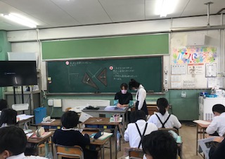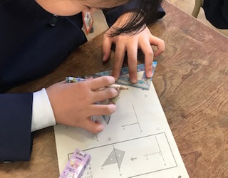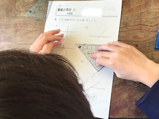 三角定規の直角部分を使って正確に垂直な直線をひきます。慣れるまで、なかなか難しけれど、練習です!