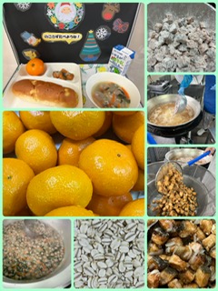 さけのマリネ 肉だんごと麦のスープ みかん おさつパン 牛乳