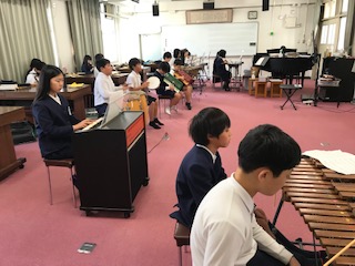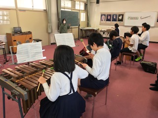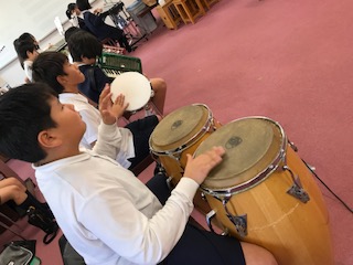 5年1組の合奏の様子です。コンガが心地よく響き、打楽器が全体のリズムとテンポをリードしていました。