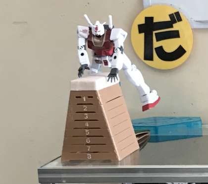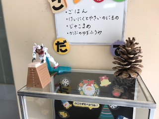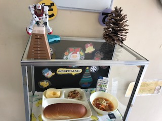 給食室前にある配膳サンプルケースです。先日から、ケースの上で懐かしいキャラクターが跳び箱をしています!子ども達もこれを見て大喜びでした。