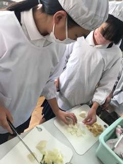 普段は使いなれていない包丁などの料理道具ですが、教え合い、協力してがんばっていました。なかなか上手に切れています。
