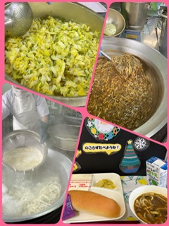 「カレーうどん」は、牛肉を主材に、うすあげ、玉ねぎ、にんじん、青みに青ネギを使用しています。寒いこの時期に体の温まる一品です。