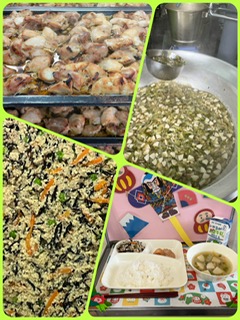 「鶏肉の甘みそ焼き」は、鶏肉に料理酒、砂糖、みりん、しょうゆ、赤みそを合わせて下味をつけ、焼き物機で焼いてます。お味噌の香りとしっかりとした味付けでご飯がすすむ献立になっています。
