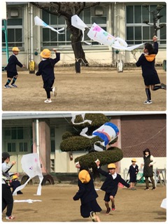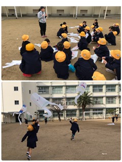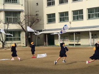 寒さを感じる毎日ですが、元気いっぱい1年生は運動場で「たこあげ」をしていました。手作りのたこをもって、はしり少しでもあがると大喜びでした。風向きを考え、コツをつかむ様子も見られました。