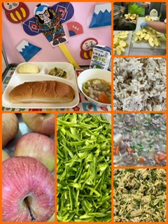 豚肉と野菜のスープ煮 カレーソテー りんご レーズンパン 牛乳
