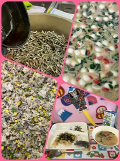 「れんこんのちらしずし」は、豚肉、れんこん、グリンピース、コーン、かんぴょうを使用し、こんぶ(粉末)を加えて旨みを増した混ぜごはんです。喫食時に子どもたちが、きざみのりをかけて食べます。「ぞう煮」は、お出汁の香りがして白みそを多く使用しているので関西風のおぞう煮に仕上がっています。白もちや年1回のなにわ伝統野菜のきんときにんじんを使用しています。