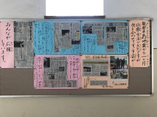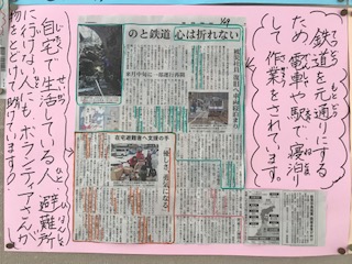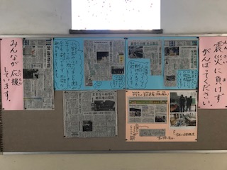 新聞離れ、ニュース離れの現在、少しでも子ども達に文章や言葉から伝えたい。立ち止まって触れてほしい、と願いを込めていろいろ掲示を作っています。今は、新聞委員会の掲示板を借りて震災を伝えています。総合的読解力にもつながるようにと、伝えたい部分に線を引いています。何人が読んでくれてるでしょうか?