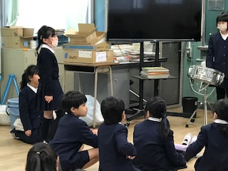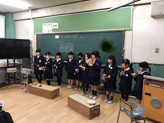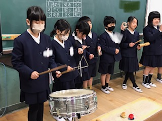 楽器を選び、メロディに合わせて音作りを班で練習してきました。今日は成果を聞き合う班での発表会です。緊張しながらも楽しそうに発表していました。