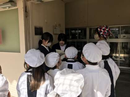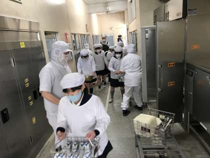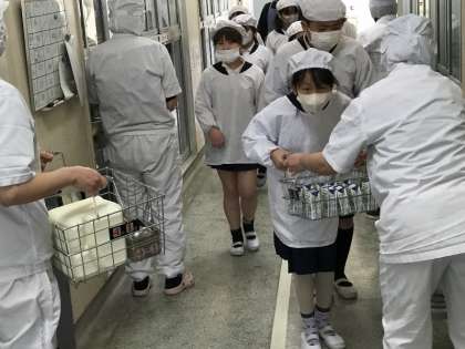 毎日おいしい給食を食べていますが、食べる前には給食当番が給食室に行って、牛乳やパン、食器などを運んでいます。