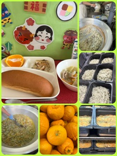 押麦のグラタン 豚肉と野菜のスープ デコポン 黒糖パン 牛乳