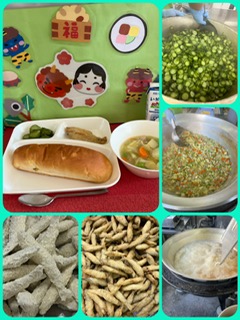 わかさぎフライ 洋風煮 きゅうりのピクルス おさつパン 牛乳