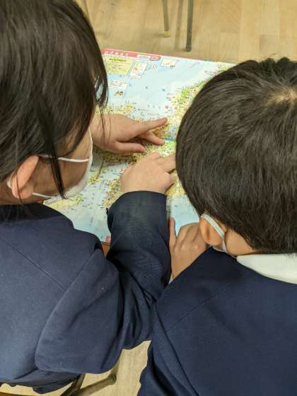 4年の社会では、地図帳を使って毎時間、簡易なゲームを行い、楽しく地図に親しめるようにしています。