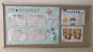 保健室前の掲示板では、1年間のふりかえりをしています。