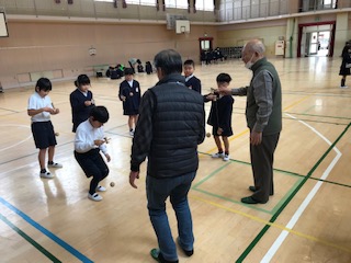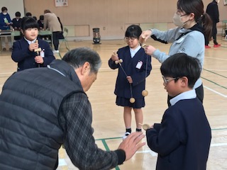 けん玉は腕だけでなく、膝のバウンドと体全体のリズムで、玉をさらに乗せることを教わりました。一度コツをつかむと、どんどんできるようになっていました。さすが、子ども達の能力は柔軟で、可能性がいっぱいです。