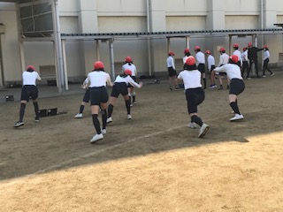 グループに分かれて、ソーラン節をていねいに練習しています。互いに動きや息を合わせて仕上げに向かっています。動きがそろって、声もよく出ています。
