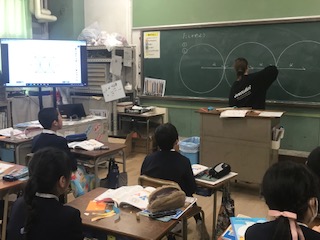 円や三角形を組み合わせた複雑な問題を解く練習問題です。黒板での先生が描く大きな図形や書画カメラに映る内容をしっかり見て、理解しながら学習を進めています。