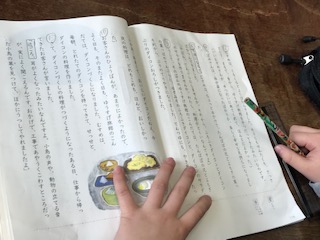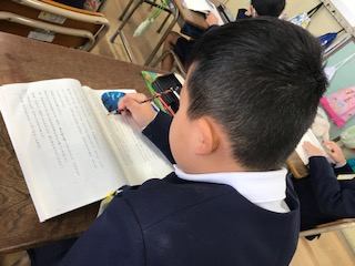 物語の中で、時と場所を示す言葉に着目して読み進めています。線を引きながらしっかり確認して読むことはとても重要です。ベーシックで手軽な手法の中に、大切な学び方の技が隠れています。自主学習でもこの方法は使えます!