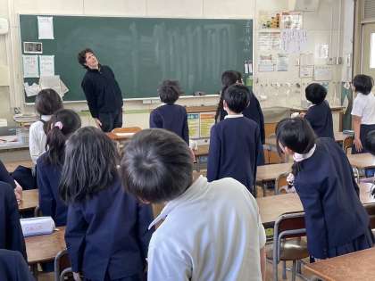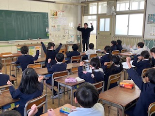 待ちに待った、マッツ先生の英語授業です!子ども達は、マッツ先生の姿を見たとたん、ワクワク、ドキドキ!「マッツせんせーい!」とかけよっています。
