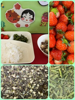 「すき焼き煮」は、子どもたちに大好評な献立です。牛肉を主材に、糸こんにゃく、とうふ、旬のはくさい白ネギ、まいたけを使用していま