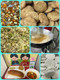 「チキンレバーカツ」は、ほんのりカレー味がついて食べやすく、不足しがちな鉄を摂る事ができます。「ケチャップ煮」は、豚肉、じゃがいも、玉ねぎ、にんじん、青みにさんどまめを使用し、子どもたちが大好きな味つけのケチャップやチキンブイヨンで煮込んだ煮ものです。