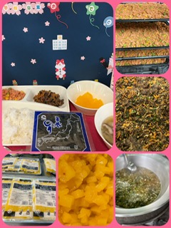 手巻きごはん(牛肉のコチジャンいため、さけのカラフルそぼろ) すまし汁 ダイスゼリー(みかん) ごはん 牛乳
