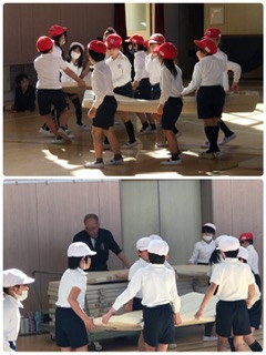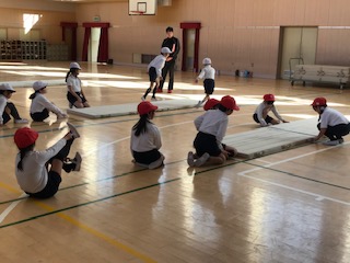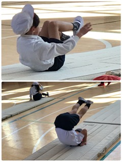 前回り、後ろ回りの練習です。手をついてあたまと首を中に入れ姿勢を丸く小さくして、クルン!っと回るのが、コツです。マットも協力してかたづけていました。