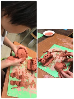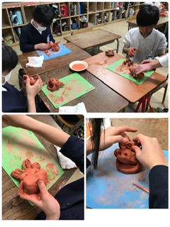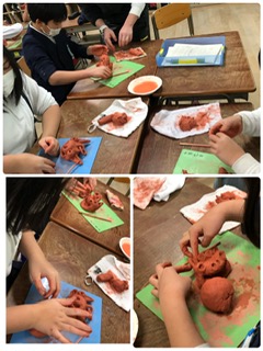 土粘土が柔らかいうちに、一気につくらなければなりません。自分のイメージを膨らませながら、時間内に仕上がるように、真剣に取り組んでいます。頭、胴、脚のパーツごとに作成を進めます。