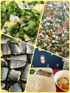さごしのおろしじょうゆかけ さといもと野菜の含め煮 なのはなのおひたし ごはん 牛乳