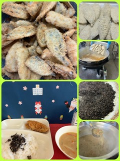 「牛ひじきそぼろ」は、牛ひき肉とひじきを炒め、砂糖、みりん、しょうゆで甘辛く味付けし、しそを加えて風味を増しています。ご飯がすすむ献立になっています。「いわしフライ」は、さくさくに揚がっていて食べごたえのある大きさでした。