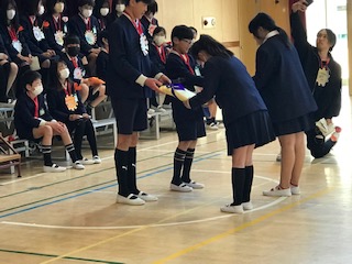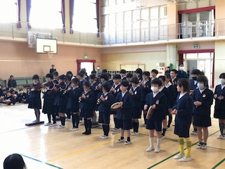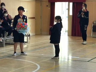 楽器演奏のあと、花束にした手作りフラワーをプレゼントしました。6年生からも手づくりぞうきんが、贈られました。学校をピカピカにしましょう!