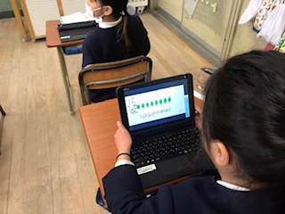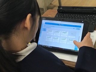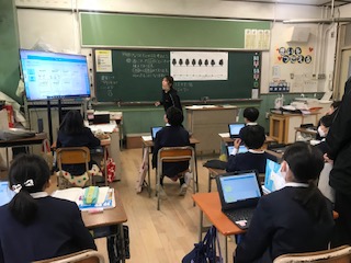 タブレットの画面では、友達の考え方も一斉に見ることができます!黒板での説明とタブレットの画面、互いの良さをいかした授業です。