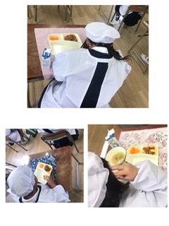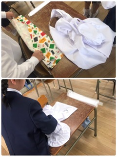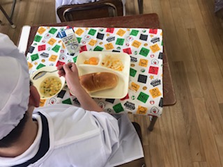 給食を食べ終わったら、後片付けです。食器をかごに返したら、一人一人エプロンを脱いでていねいにたたんで、給食袋に直していました。大き目のエプロンですが、たたむ姿は一生懸命でした。これからできることをたくさん増やしてくださいね。