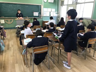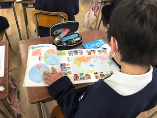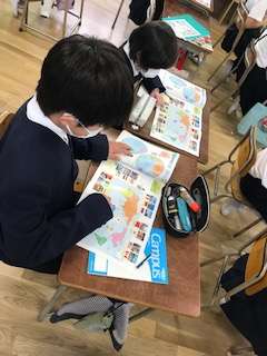 中学年では大阪市・大阪府の事を中心に学んできました。5年からは、視野を大きく広げて、世界とのかかわりを含め日本について学びます。今日は教科書の世界地図を見ながら、社会科の導入授業でした。いろいろな国の事で知っていることを出し合い興味を高めていました。