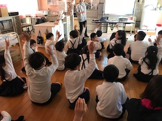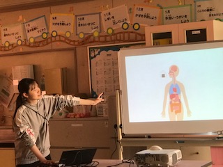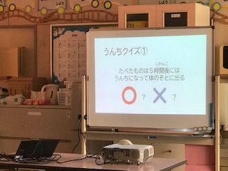 発育測定をする前に、養護教諭の保健についての学習があります。今回は、「ウンチについて」つまり、排便についての学習です。初め「ウンチ」と聞いて笑いが起こりましたが、学習を進めるうちに、排便と健康のつながりを理解していました。