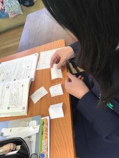 線対称や点対称な図形について学んでいます。具体的操作を通してしっかり理解を深めながら進めています。図形の左右が全く重なる点対称な図形の特徴を調べていました。