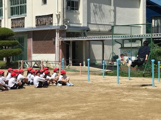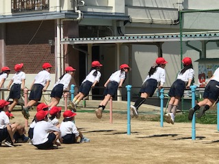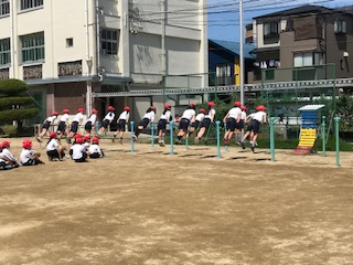 鉄棒運動の「つばめ」を練習しています。鉄棒で姿勢をピン!と張って維持するのも筋力が必要です。全員がそろっていることも、すばらしですね。