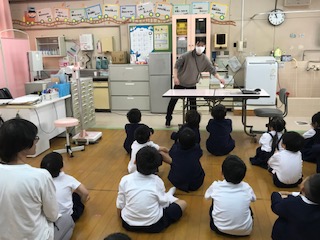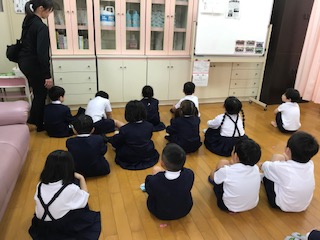 初めての視力検査です。順番が来るまで静かに後ろ向きに待つこと、検査ではどうするのかなど、養護教諭の先生の話をよく聞いて検査を受けました。