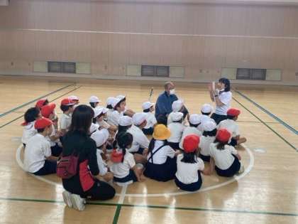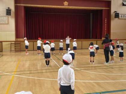 ラーメン体操の後、新しい背の順に並ぶ練習をしました。