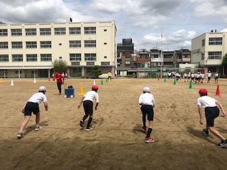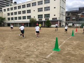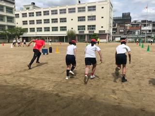 今日学習した走り改善の大きなコツは、スタートの仕方です。これまでより低い姿勢で構え、勢いよく走りだします。最後には「よーい、スタート!」ではなく、ちょっと専門的な「セッツ!ゴー!」の合図で、どんどん走り込みをしていました。全員、かっこよく輝いて走っていました。