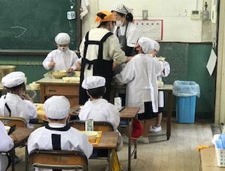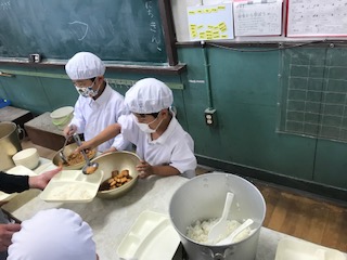 とても分けるのがうまいですね。6年生の様子をしっかりと見ていたので、一口サイズの厚揚げや焼さけそぼろも、決められた量を同じように配ることができていました。