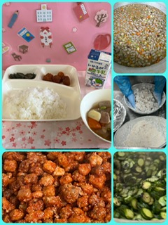 「まぐろのオーロラ煮」は、しょうが汁、料理酒で下味をつけたまぐろにでんぷんをまぶして揚げ、ケチャップ、砂糖、赤みそで作ったタレをからませています。子どもたちに大好評な献立です。