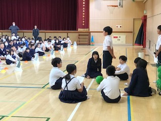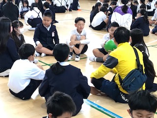この日、朝の木曜集会は、なかよし班の活動でした。講堂に集合して班ごとに、自己紹介ゲームを楽しみました。運営委員会の説明もとても上手にできました。