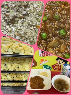 「タコライス」は、炒めたひき肉、玉ねぎをカレー粉、ケチャップ、ウスターソースなどで味付けし、青みにグリーンピースを使用し、ごはんの上にかけて食べます。沖縄料理の一つです。子どもたちに好評な味付けになっています。