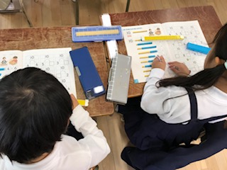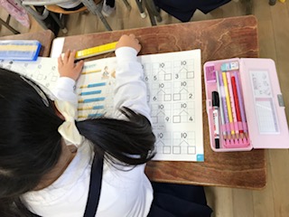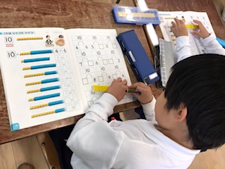 10をまとまりとして考えることを学習中です。ブロックを操作しながら、答えを求めています。