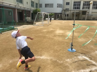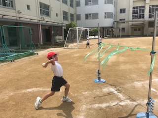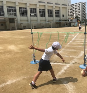 運動能力調査、スポーツテストのソフトボール投げの測定をしています。上手にかっこよく投げています。
