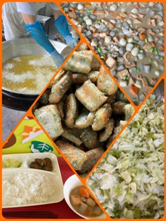 「いそべあげ」は、あげ衣にのりを混ぜたり、材料にのりを巻いて衣をつけたりして、あげる料理の事です。「ちくわのいそべあげ」は、ちくわに青のりを加えた衣をつけ、なたね油で、あげています。青のりの風味がして子どもたちにとっても人気のある献立です。